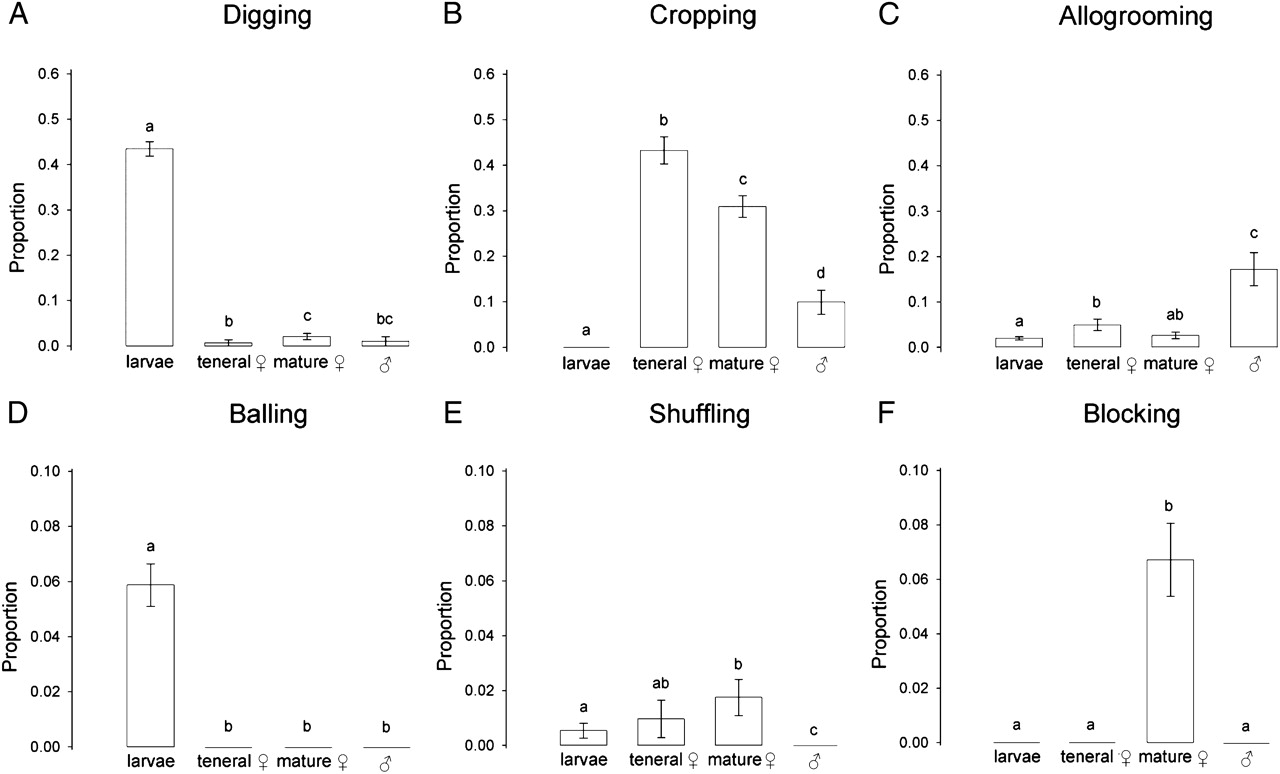 Their most important results are summarized in the Figure above. Biederman and Taborsky show that the adults remaining in the nests cooperate to help raise their sisters, by harvesting fungus and disposing of waste. The most exciting part of their observations was seeing the way that the larvae cooperated right back with their siblings: larvae were responsible for enlarging the nest and for wadding up waste for convenient disposal by their adult siblings. While larvae are known to perform more subtle tasks in many eusocial species—often digesting what is hard-to-digest food for the adults—this is currently the most spectacular known instance of larval helping in a eusocial organism.